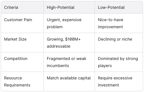 Systematic evaluation prevents pursuing attractive-sounding ideas without market foundation.
